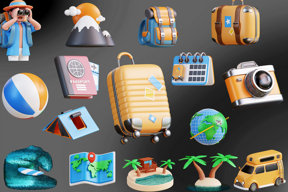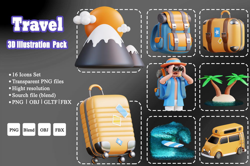 This is a Travel 3D Icon Pack that I made with the best quality, you can use this 3D pack as a presentation, social media post, or UI/UX design to make it attractive, full of color. This 3D travel pack includes Blend files, PNG, Obj, and Fbx.